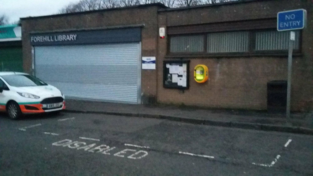 Forehill, Holmston & Masonhill Community Council have installed Heart Start Defibrillators, (AEDs) at two locations in our area, Forehill Library, Mt Oliphant Crescent and the Spar store on Hillfoot Road. The machines are available twenty-four hours a day.