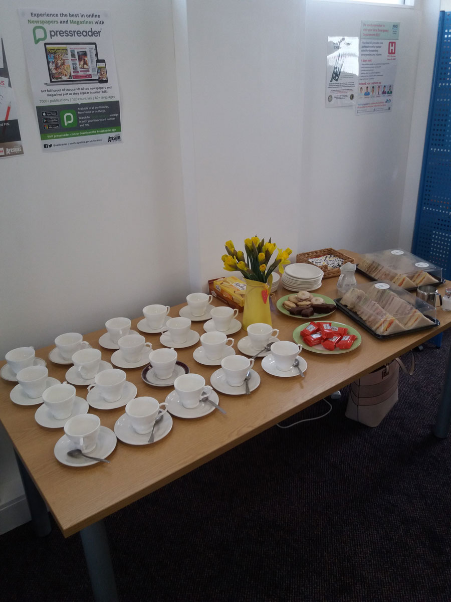 FHMCC hosted a daffodil tea at Forehill Library on 25th April 2018. The event was kindly funded by a ‘neighbour’, tea and coffee was provided from the library kitchen. Carnegie Library supplied their china set for our posh-nosh and a fun afternoon was had by all! Thanks to Shona and Ailish for your hospitality (sorry about the crumbs!) And thanks to all our residents, community councillors and local businesses who support the work of FHMCC!