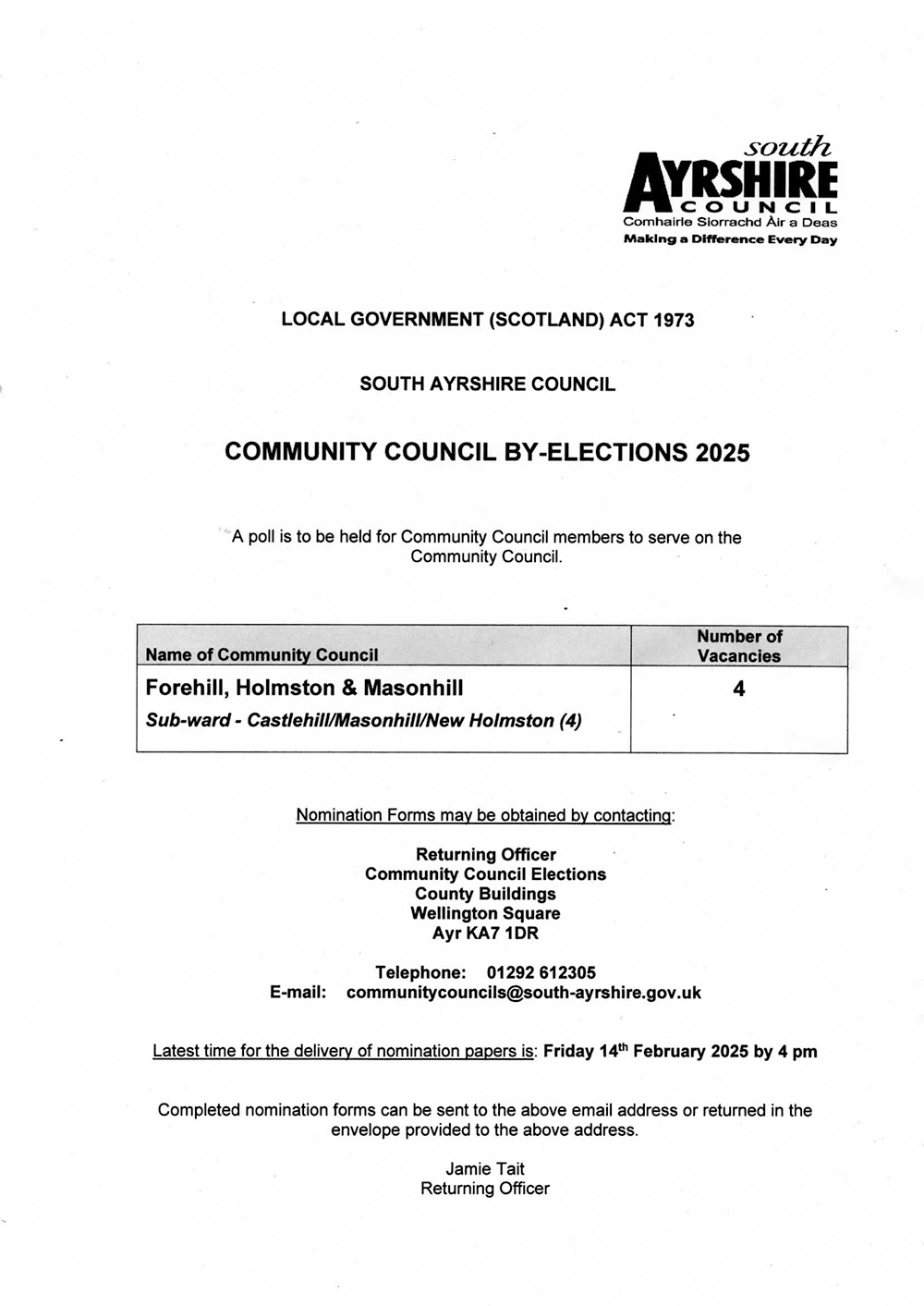 Posted on behalf of Forehill, Holmston & Masonhill Community Council Chair and members.